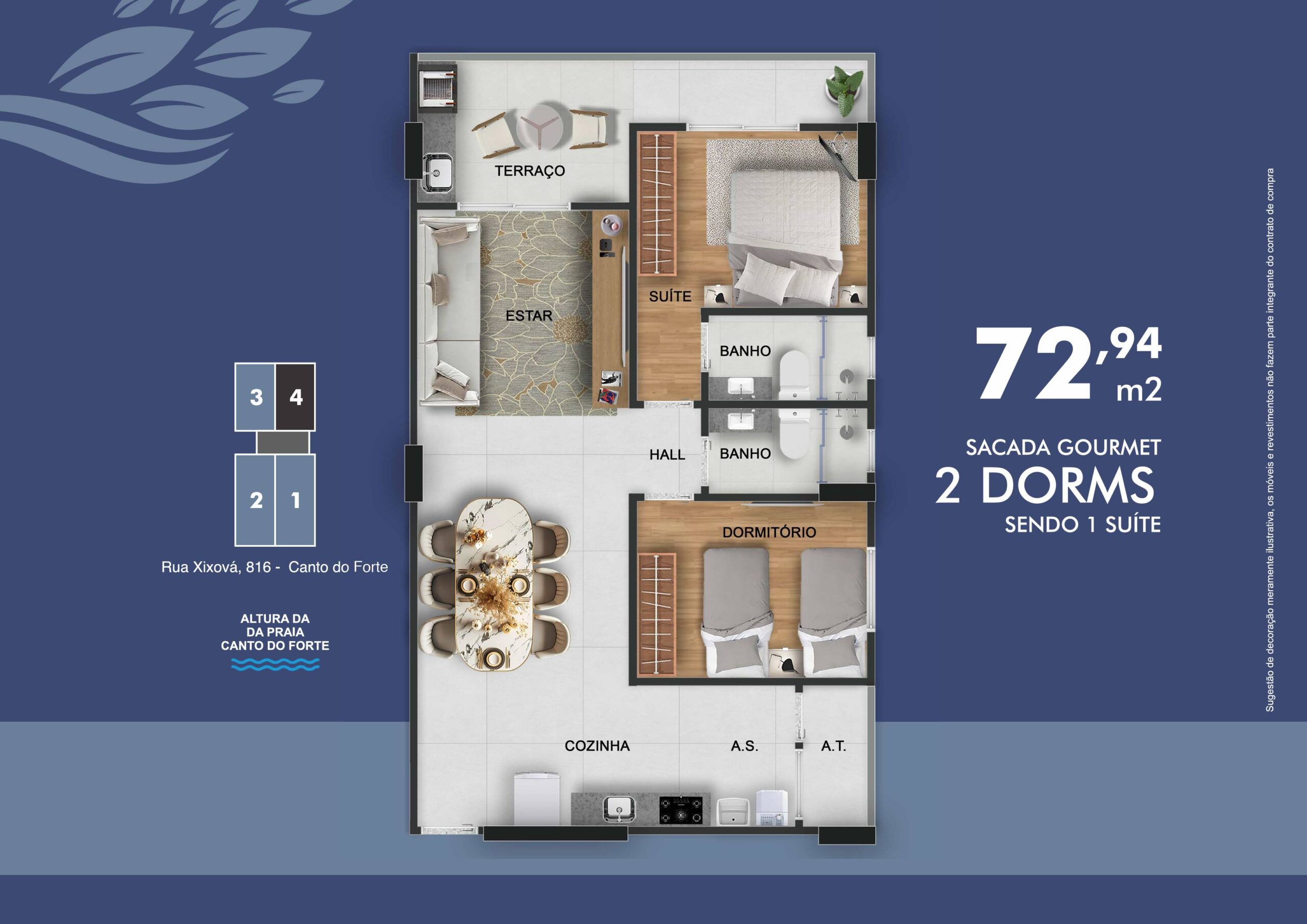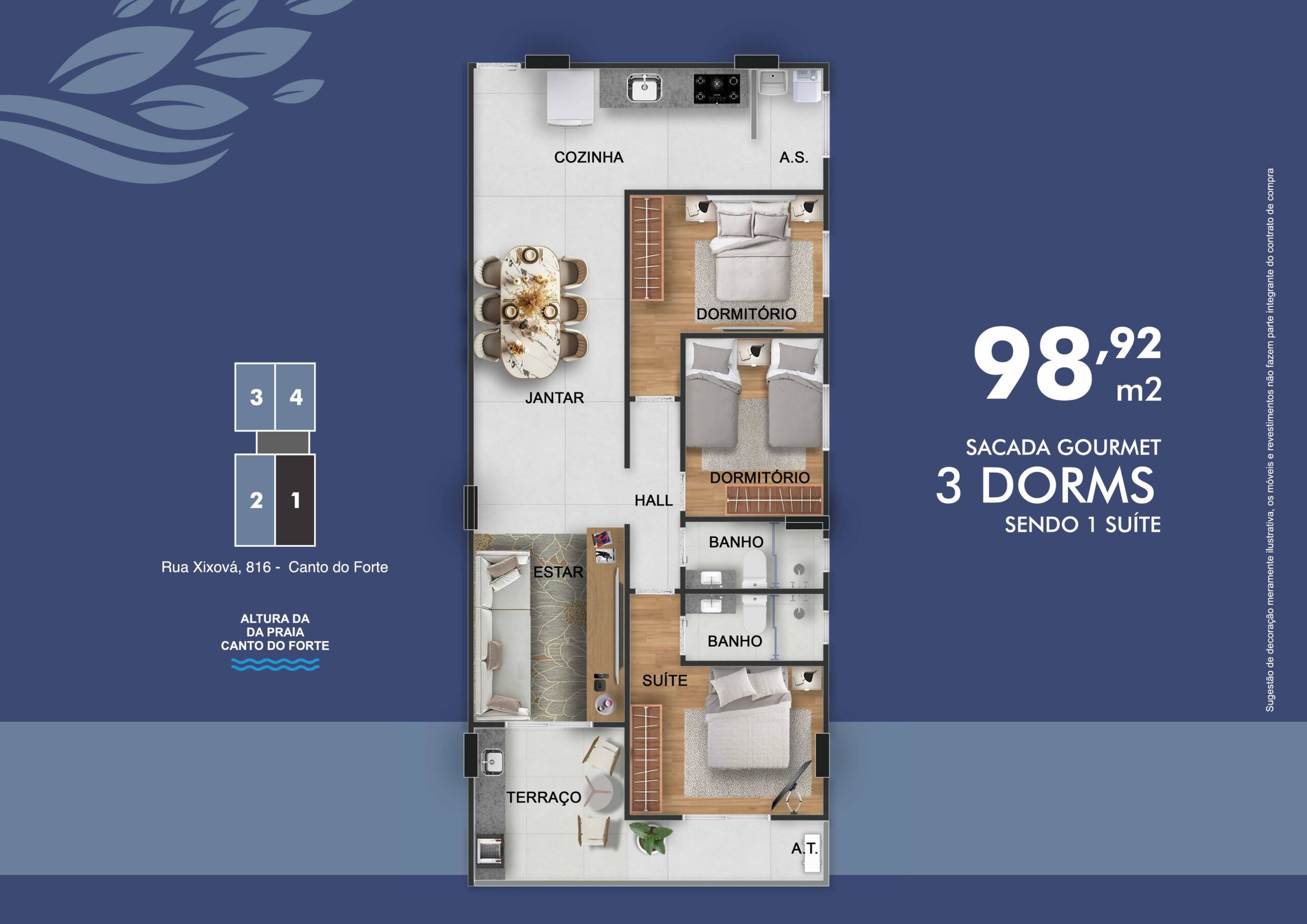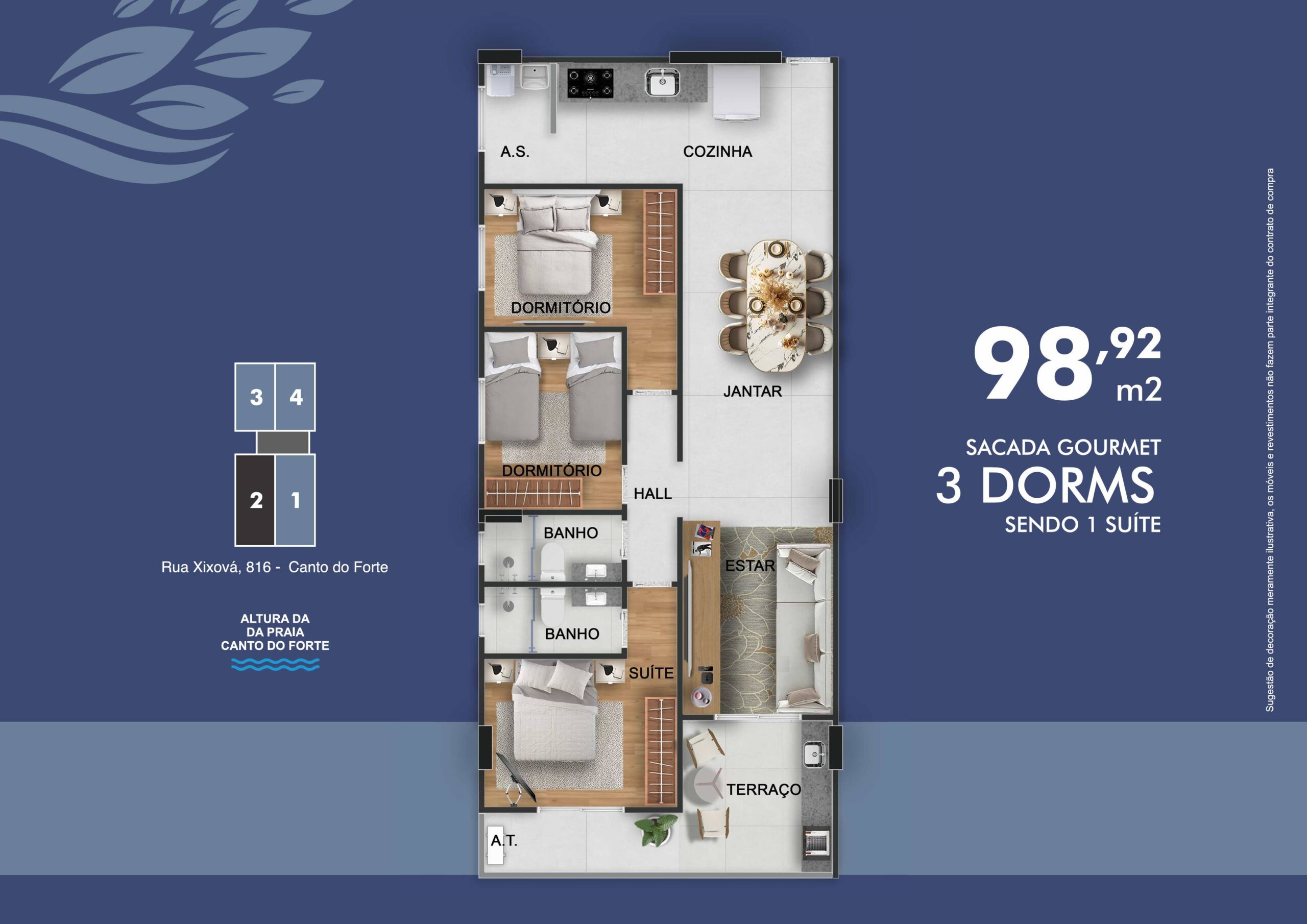 Uma região com moradias seletivas, infraestrutura completa, mercados renomados, o melhor centro gastronômico da cidade e praias perfeitas para viver todos os dias como se fossem férias. Apartamentos com metragens de 72,94 m² a 98,92 m², planejados para oferecer conforto e elegância.