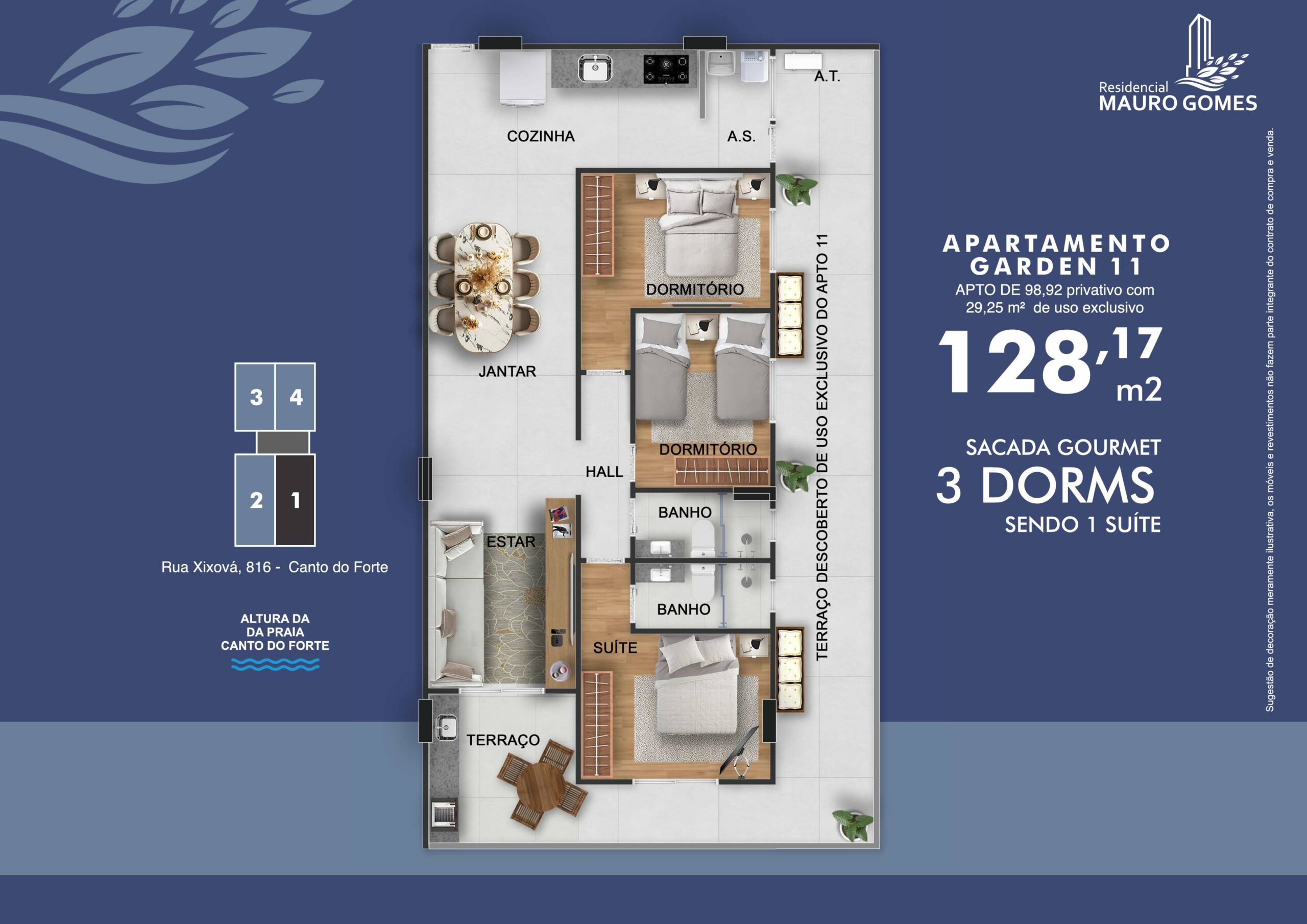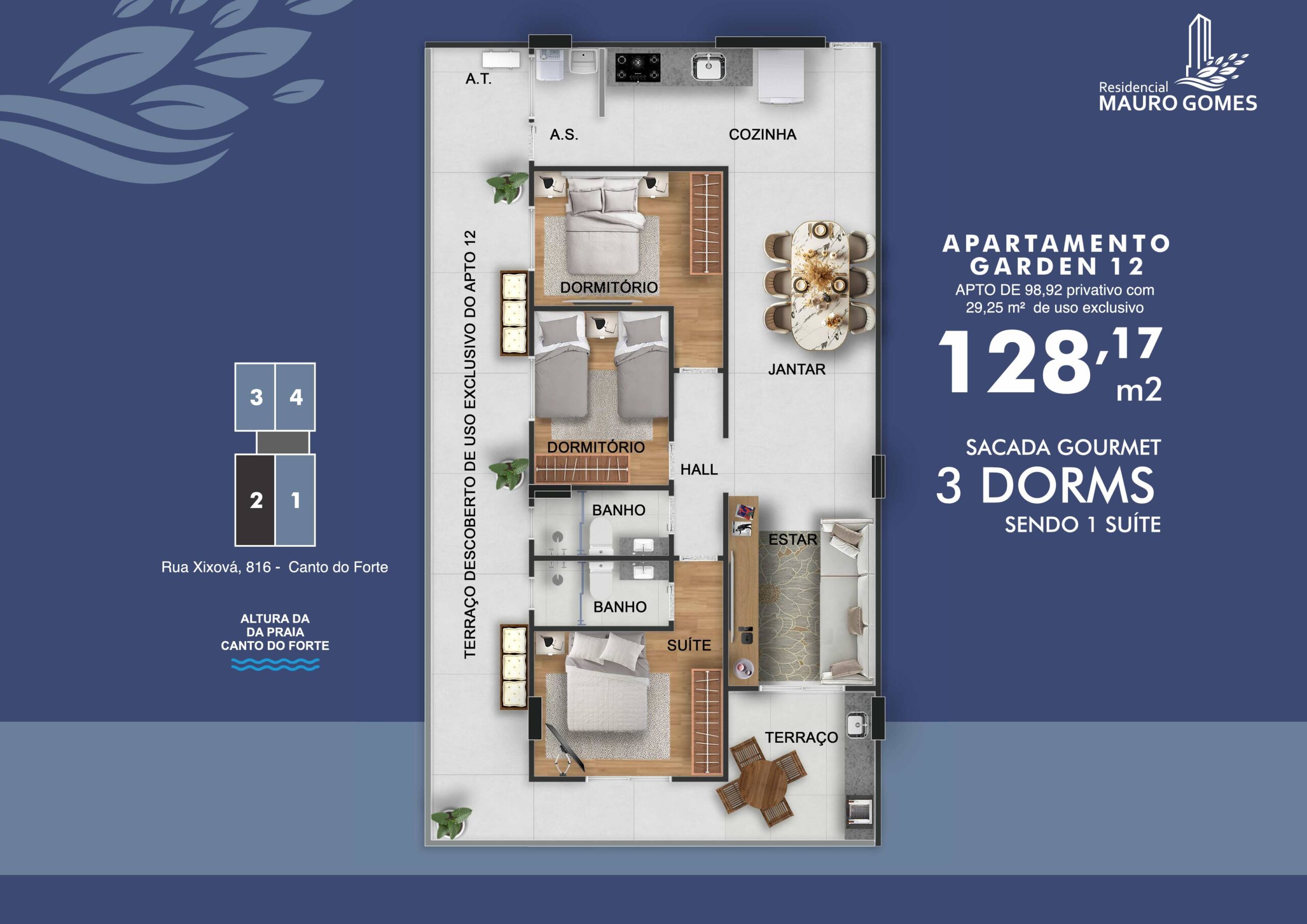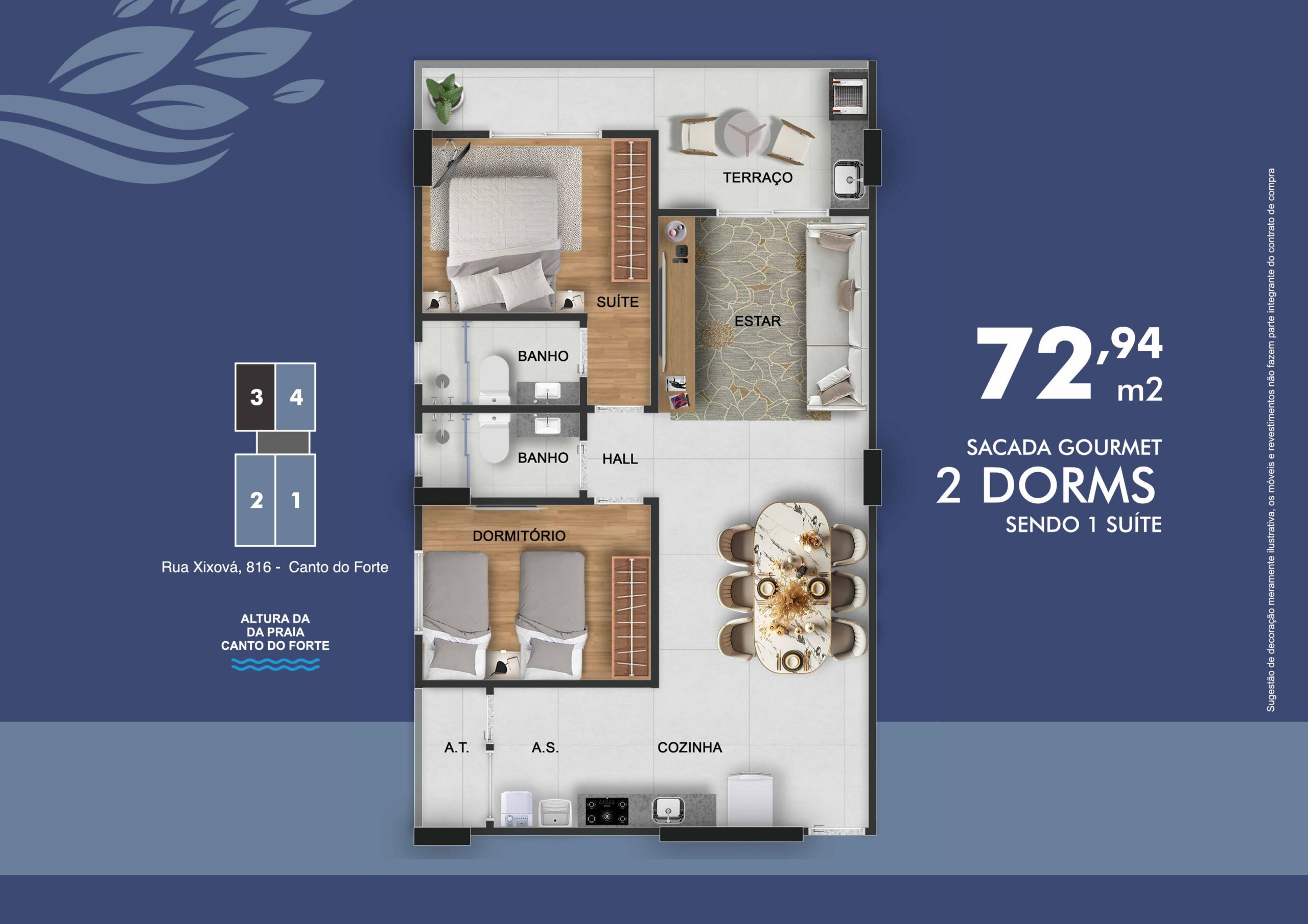 Uma região com moradias seletivas, infraestrutura completa, mercados renomados, o melhor centro gastronômico da cidade e praias perfeitas para viver todos os dias como se fossem férias. Apartamentos com metragens de 72,94 m² a 98,92 m², planejados para oferecer conforto e elegância.